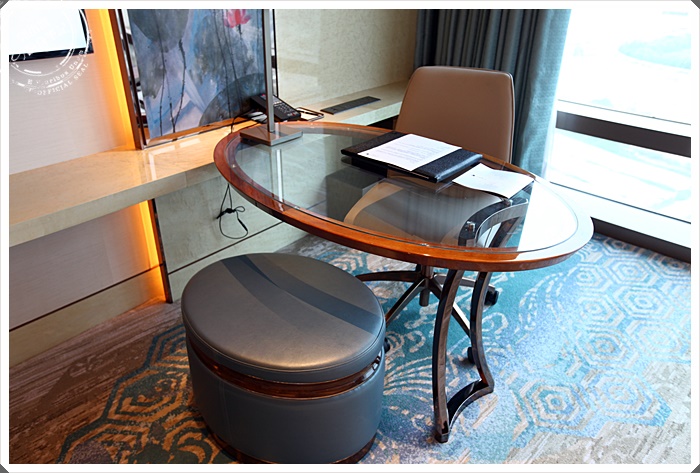 書桌頗為高雅,坐下來高度也剛好,旁邊備有多孔插頭跟USB線,對於我這個隨時都要用電腦的人超重要。 |