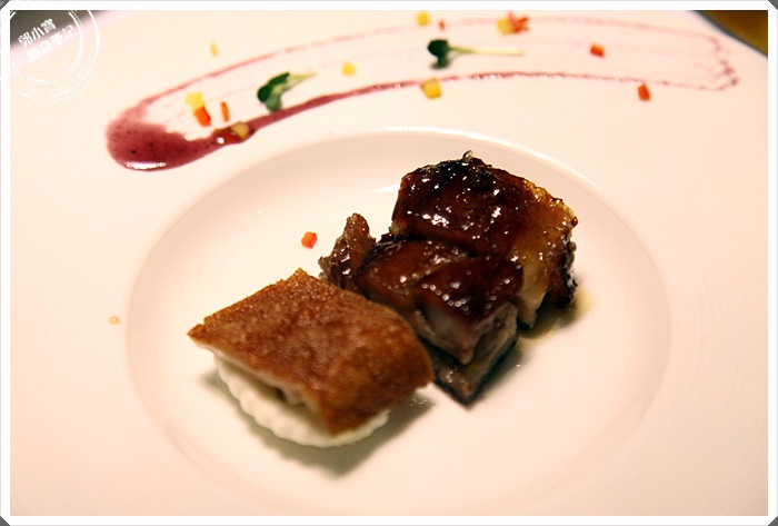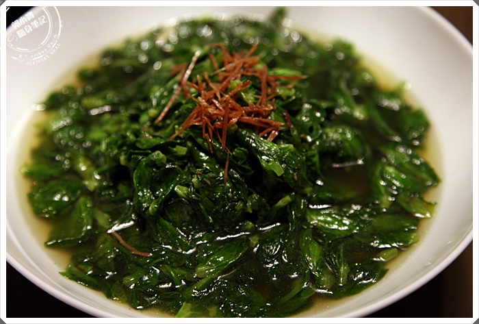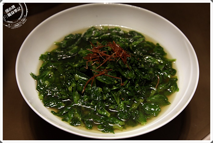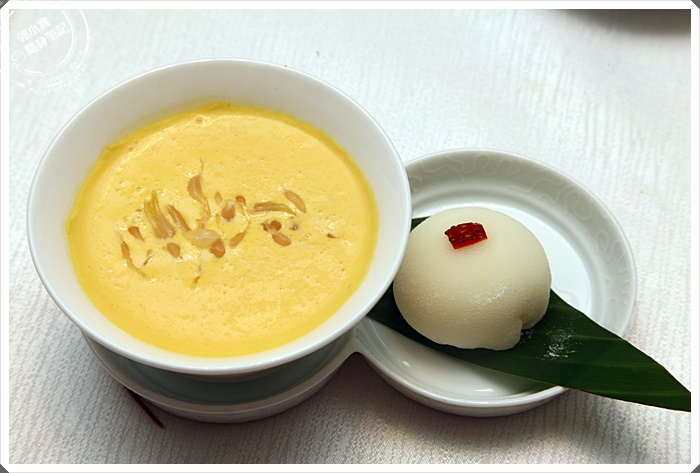 沾滿蟹粉的石柳球咬下一口真的是滿滿的螃蟹鮮味,石柳球外皮是蛋皮做的,裡面包的餡料以蔬食為主,吃起來非常爽口美味,因為蛋皮裹著濃郁蟹粉,所以吃起來層次相當豐富,是我當天最喜歡的前三道菜之一。 |