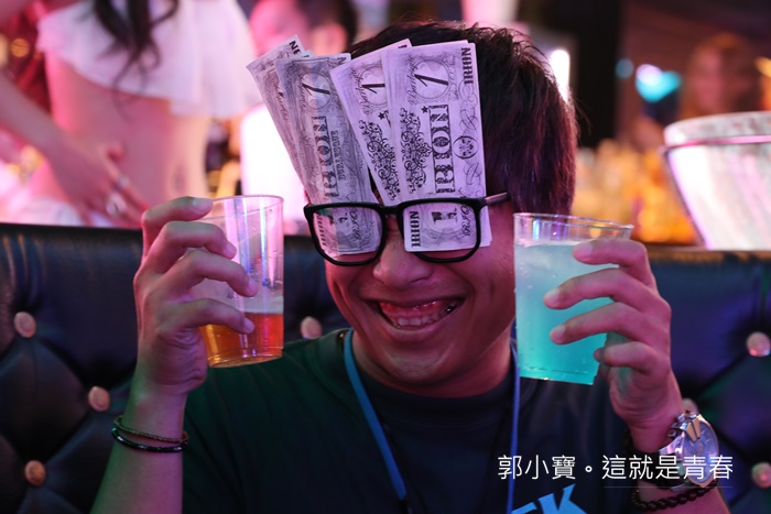 裡面的場地大約可以容納110人,後面三排有沙發,但是我們一股腦往前面擠,幾乎每一場都爆滿,建議最好還是提早來買票,記得買小費眷,就像朋友這樣把自己搞得跟土豪一樣,飲料可以選擇酒精飲料跟無酒精飲料,我們這群人一進來幾乎是解除封印的狀態,就是要放鬆啊!!!!!!!!!! |