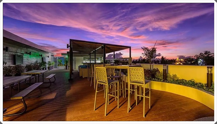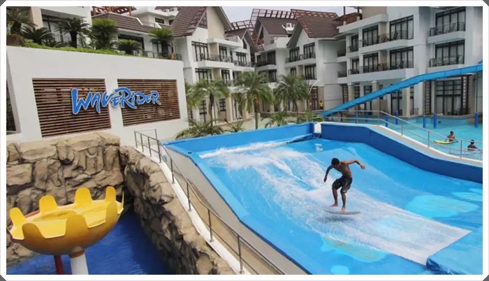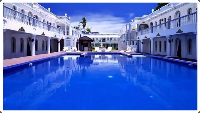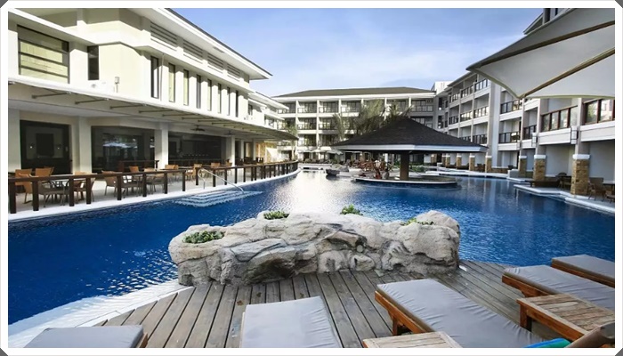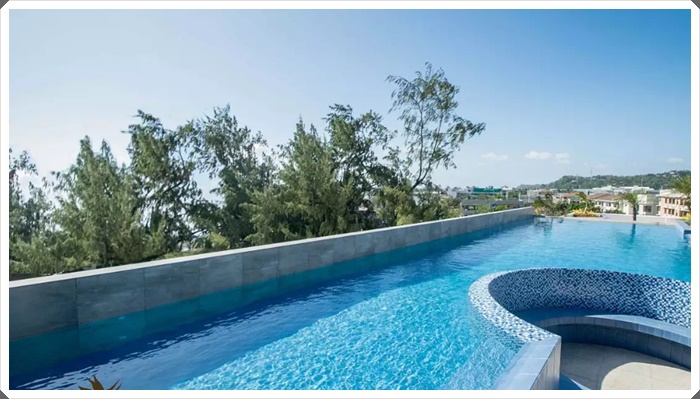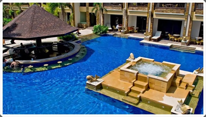 在飯店超棒泳池邊喝著雞尾酒