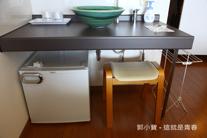 門間入口是盥洗台跟化妝台,底下是小冰箱,有效的節省空間的設計。 |