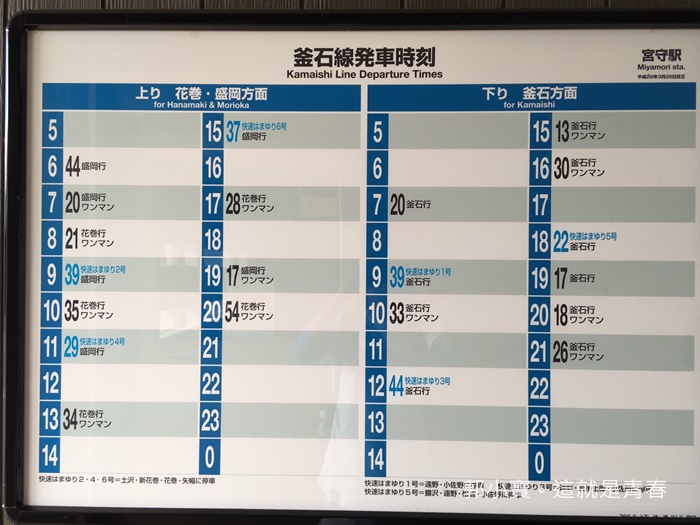 附上宮守站的時刻表,回到新花卷後才可以去新花卷站旁的宮澤賢治童話村繼續行程,我個人最推薦的行程是回到花卷逛城下町,更晚的時候再去童話村,因為童話村的晚上更有效果呢!!!