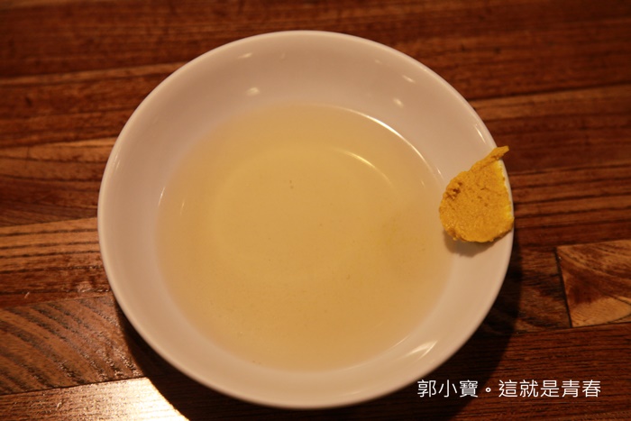 每個人都會有一小碟的盛盤,裡面加了些許的高湯抹上黃芥末,好費工的感覺,湯其實喝起來沒有甚麼味道,我超懷念台灣黑輪攤的湯頭XD
