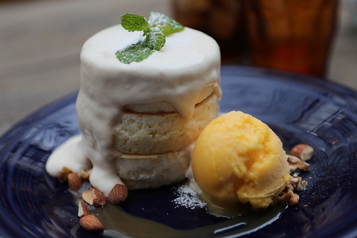 有一點像是我還滿喜歡的厚鬆餅,但是口感比較紮實一點,自從吃到空氣鬆餅後,這類型的厚鬆餅瞬間退了幾個名次,且他們家的口感也比較黏了一點,每隔一段時間都會有不同的搭配,像我去的季節隱藏版就是搭配芒果!