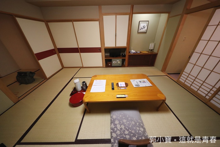 房間還滿大的,提供給我們的是主要的雙人房型,因為日本旅館基本上都是算人頭的,基本上進來的時候都還是完整著狀態,飯店會趁妳去洗溫泉或是吃飯的時候進來舖床。