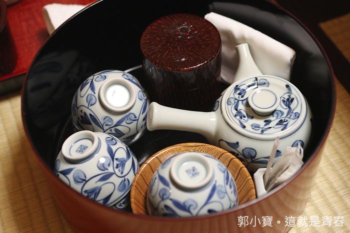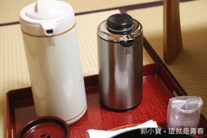 泡茶用具都在桌子旁邊,裡面茶罐有煎茶,兩壺保溫壺一冰一熱通通都有。 |