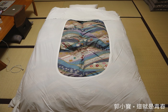 吃完飯上來的時候就看到飯店人員把床舖好了,我很喜歡睡這種舖床,尤其是棉被的部分,我個人很喜歡厚棉被最好還帶點重量的那種,日本老旅館大部分都是提供這類型的棉被。 |