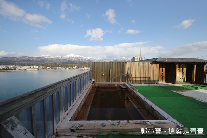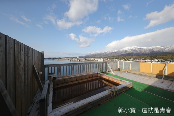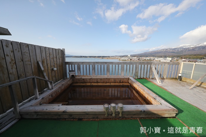 吉田家除了地下室的大浴場以外,露天溫泉的部分則是在頂樓,一邊泡湯還可以欣賞整個加茂湖的景色,還可以看到雪山的景色,帶點微涼的天氣真的非常舒服。