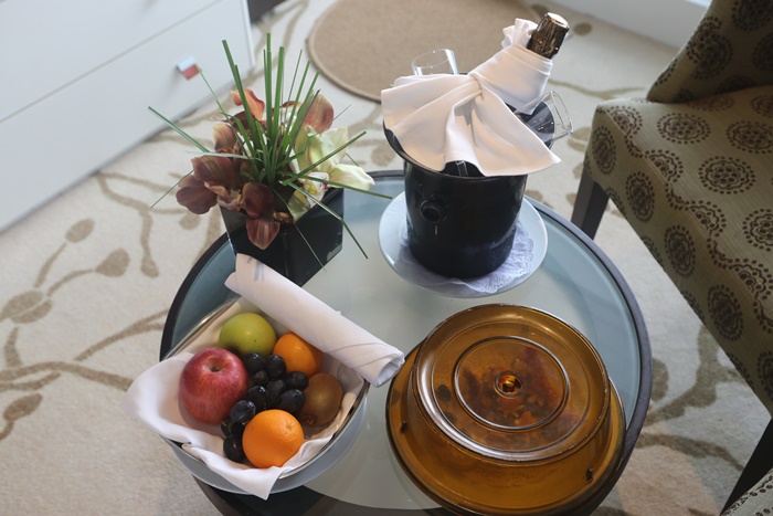 一進門就可以看到點心下午茶跟水果,還有一瓶免費香檳,後面幾天都會換上不同的水果,還滿讚的。 |