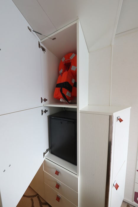 冰箱跟救生衣都在最右邊的櫃子裡,底下還有櫃子跟抽屜可以運用,不管妳行李箱裡面帶了多少衣服跟東西,這些收納空間絕對都可以滿足妳,加上妳在日本採購的商品,保證妳都可以塞好塞滿XD |