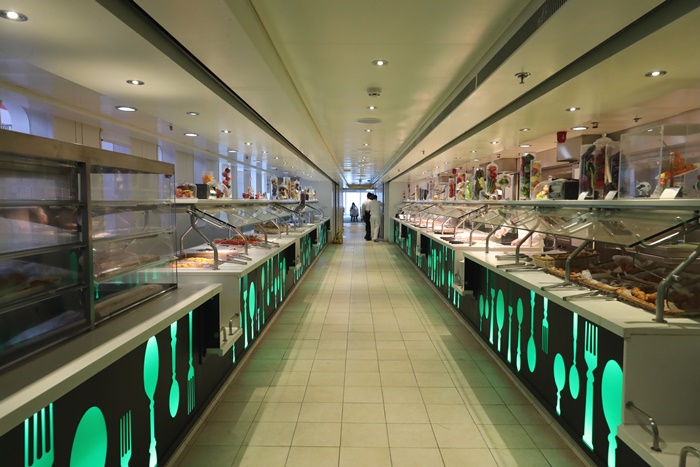 自助吧餐廳左右各有有一個長廊,所以兩邊都可以排隊取餐,大幅的減少了取餐排隊的時間,餐廳的空間相當的大,從船尾到泳池畔都是可以用餐的空間,看妳喜歡在哪吃就在哪吃,廚師們補餐的速度相當的快,所以不要搶先恐後,絕對都可以讓你吃到飽飽的,台灣人真的很怕吃不到很愛插隊QQ |