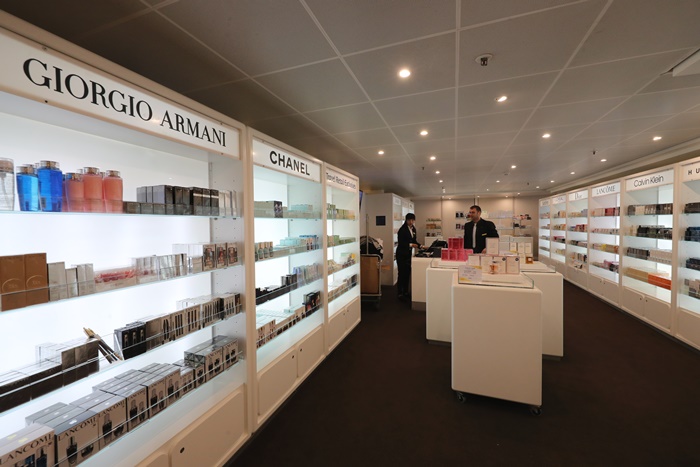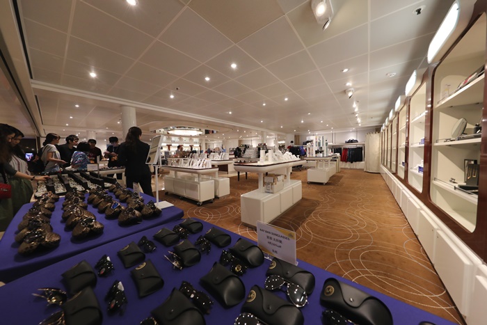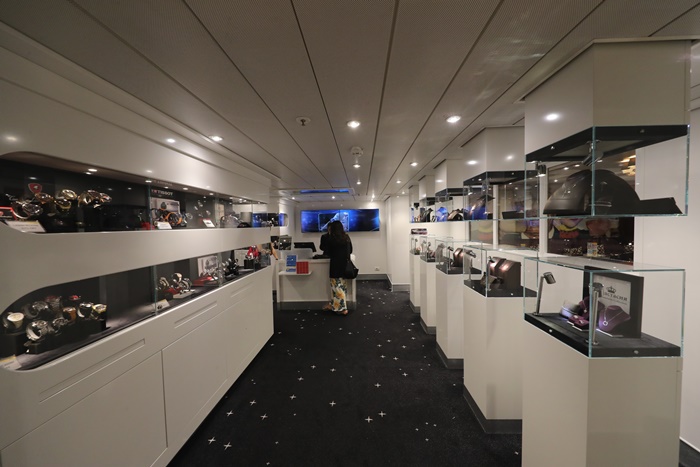 大家最喜歡的購物中心免稅店,只要一到達公海後,免稅店就會打開門迎接瘋狂採購的消費者門,這就是為什麼我一開頭就要大家千萬別忘記拿房卡去綁定信用卡,因為這免稅店真的太好買了,手錶專賣店跟菸酒專賣店還有香水專賣店,除了這些以外還有包包跟墨鏡、首飾等等,而且重點有時候還會廣播限時搶購,真的超刺激的,一聽到廣播全部的人就會狂衝狂搶,貞的一不小心就會瞬間手滑,我買了一對施華洛世奇的耳環也才10美金,是不是超級便宜的! |