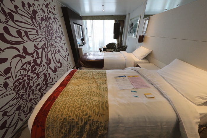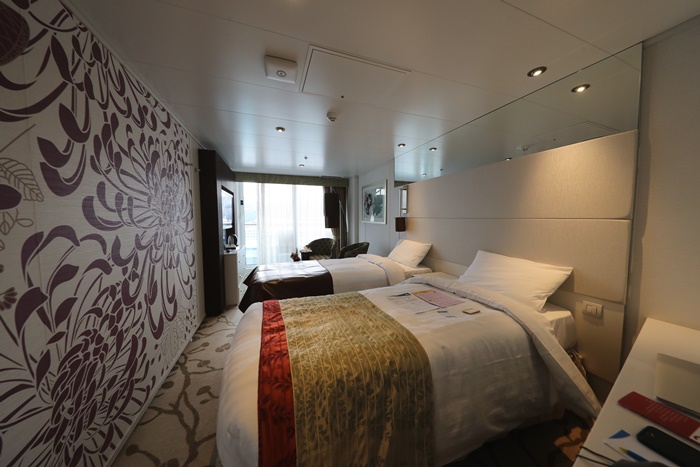 我的房間是屬於兩張單人床的雙人房,必須說真心話就是一進去我就愛上她了,一點都不輸給高級飯店的房間,裝潢跟明亮度都超有水準的,雖然新浪漫號是重新整修過的郵輪,但是距離上次整修也已經好幾年了,還能保持這樣的水準真的很不簡單,隔音設備也相當不錯,本來以為郵輪上的隔音設備都不是很好,不過這五天下來幾乎都沒有聽到其他的雜音。 |