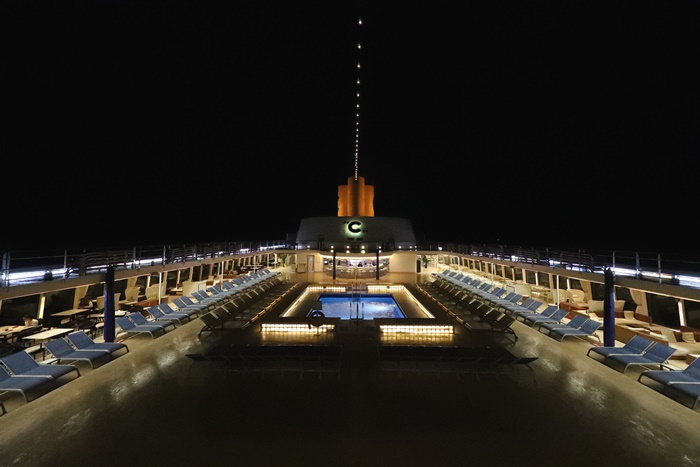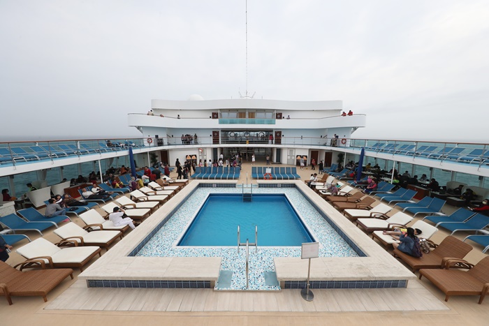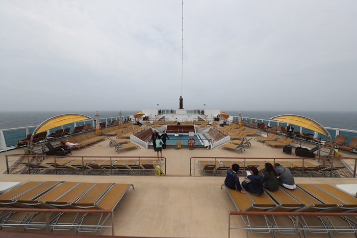 甲板這戶外空間是大家最常到的地方,不管妳是要享受日光浴還是游泳等都是在這裡啦,游泳池有兩個,這一個是小朋友用的,後面還有另一個,但是大部分的活動都是辦在這,喜歡安靜一點的可以到後方甲板那一個區域,還滿安靜的。 |