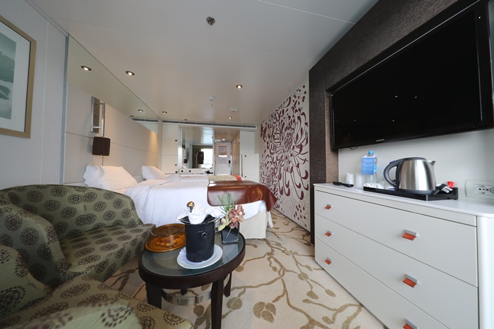 看看這光景真的很難想像是郵輪上面的房間,當天拍完照上傳臉書的時候,一堆郵輪達人都說這大概是他們看過最漂亮也最乾淨舒適的郵輪房間了,雖然我搭過的郵輪沒有很多,但是至少新浪漫號是我目前住過最棒的房間! |