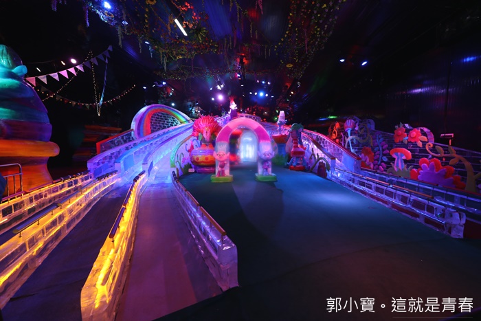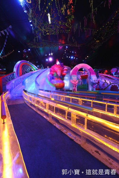 小朋友一整個玩瘋的超長冰雕溜滑梯,我可是等了很久很久才拍到這沒有人的階段,因為有些父母親並不是那麼想讓小朋友露臉,所以我還是等了很久才拍到這張空景,這溜滑梯加上七彩顏色的打燈一整個就像是夢幻城堡般的感覺。 |