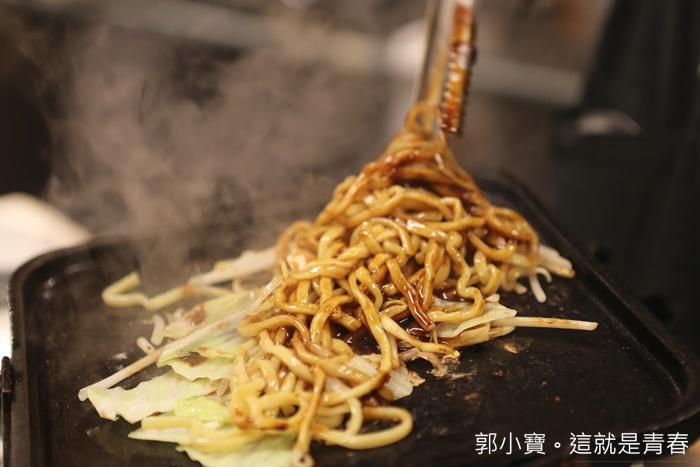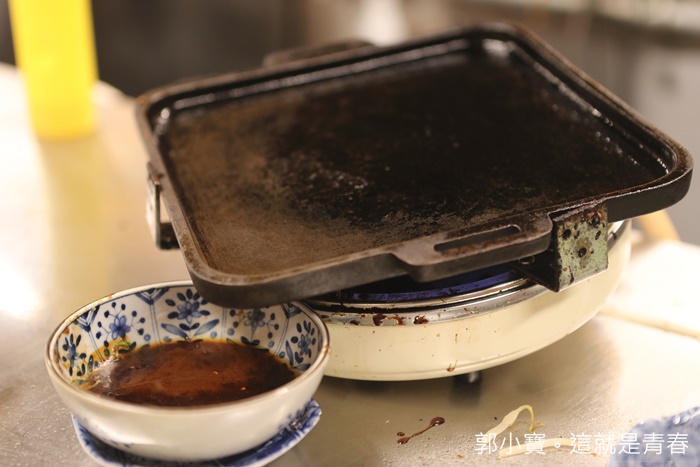 這時候之前的鐵盤店員們又換了一個新的,這新的鐵盤是平面鐵板,跟剛剛那種鐵板有一點不一樣,鐵板下的醬汁等等就是炒麵要拌入的醬汁。 |