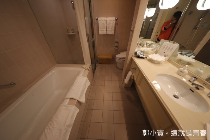 廁所的部分也超大一間的,浴缸是大浴缸可以整個人躺下去都沒問題,旁邊還有淋浴間跟免治馬桶,洗手台非常大。 |