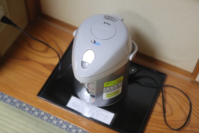 茶水桌旁邊還有茶組盒,打開後就可以看到一整套的茶具,茶具還滿完整的,跟一般日式旅館提供的簡易茶具還是有差別的。 |