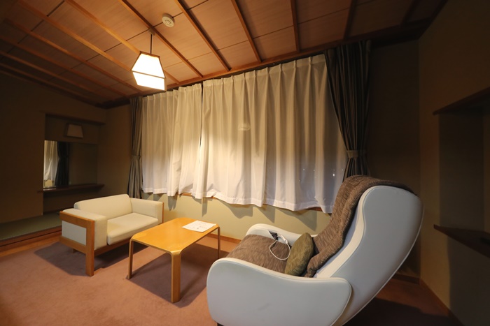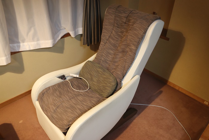 窗戶旁邊還有一個休憩區,可以坐在這邊欣賞窗外的景色,佐渡的旅館窗外大多都有美好的景色或是海岸景色,比較特別的是其中一個椅子還是按摩椅,按摩椅是簡易的按摩椅,泡完溫泉後坐在這邊按摩一下很舒服呢。 |