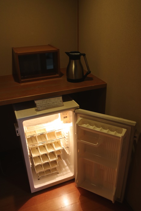 入口處玄關就有一台冰箱,冰箱內的分隔層是可以一格一格放置飲料根啤酒的,方便大家存放飲料,這樣的設計我覺得在日本非常實用,冰箱櫃上則是已經裝好的一整壺的熱開水,另外還有啤酒杯。 |