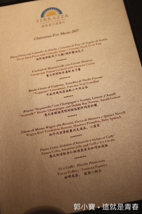 Terrazza庭園意大利餐廳的菜單本,質感也非常好,通常的菜單從前菜到主餐都是單品,所以更顯得這次套餐的划算。