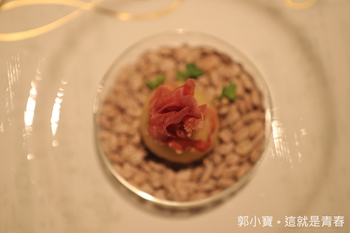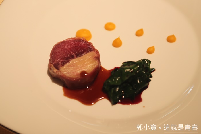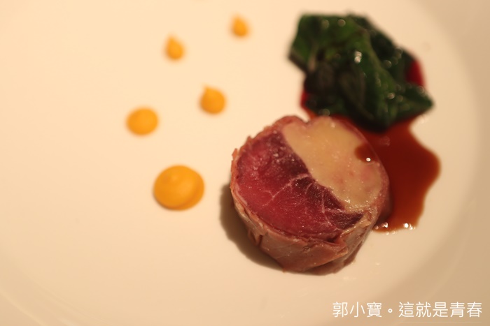 主餐讓人感覺到非常不一樣,這和牛里肌跟魚肉魚肉?的組合真的非常奇妙,外層再卷火腿的視覺真人令人感覺到驚豔,牛肉感覺似乎也是生牛肉,切了一塊馬上試試看,牛肉的不分真的快接近生牛肉的口感跟滋味,但是入口超級軟嫩又美味,搭配一旁的魚肉真的增添許多風味,還有外層的火腿讓整體的風味層次提升到一個九重天的階段啊!