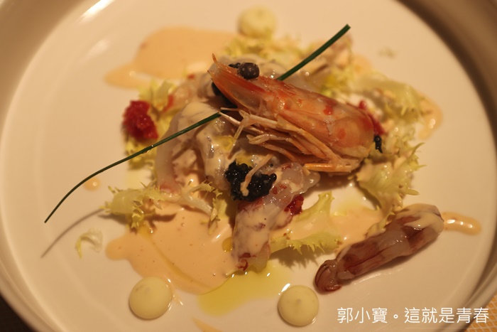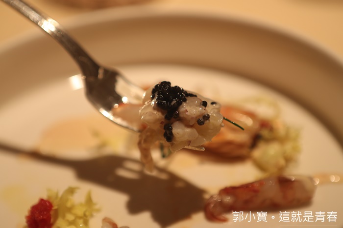 生食等級的明蝦肉先經過刀工處理劃小份一點非常好入口,放在魚子醬增添了海味,這生食明蝦的口感比一般的甜蝦口感更佳,一點腥味都沒有,魚子醬讓整體的滋味提升了許多搭配得非常好,還有特調的醬汁帶點清淡的酸甜,非常迷人。 |