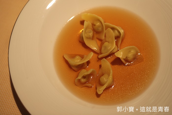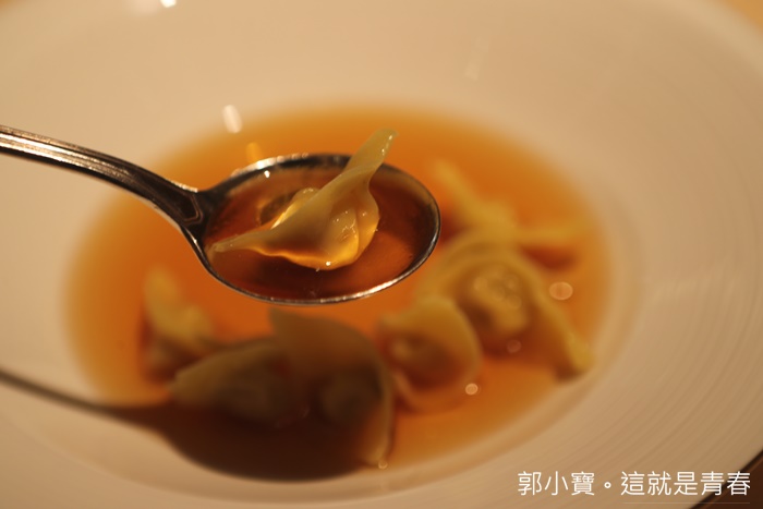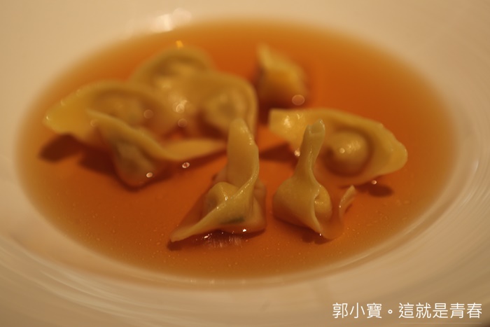 非常精緻且美味的一道湯品,湯品喝起來非常濃郁,有一點像是更濃郁的雞精,口味也偏重了一點,百分之百的源汁,搭配雲吞的外皮有點比較厚一點,咀嚼起來也比較有嚼勁,牛肉肉汁也很濃郁,混含再一起真的非常夠味,但是吃到最後會有點過鹹。 |