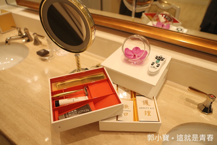 備品盒也是使用精緻的旋轉盒,誇張的是裡面不管是梳子還是牙刷、刮鬍刀等器具都是閃亮亮的金黃色,一整個就是豪氣加上貴氣,化妝鏡上面還有小液晶電視。 |
