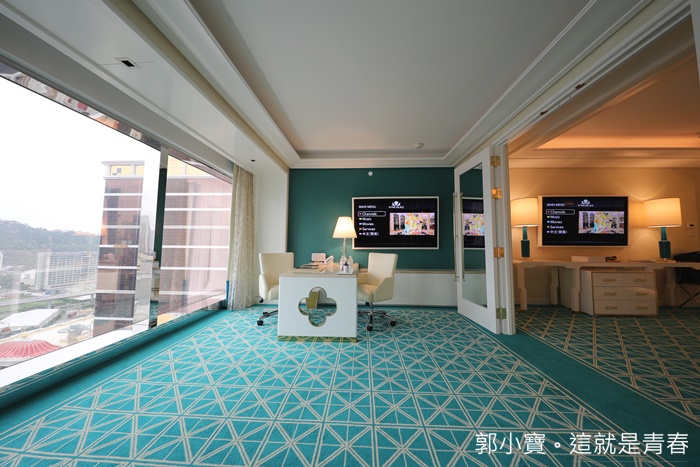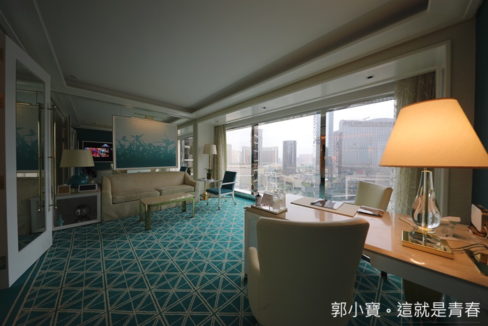 客廳的部分光線非常好,同樣以湖水綠的色系占滿了整個房間,客廳的落地玻璃窗面對的就是永利皇宮的水舞池,這面向的房間非常搶手,晚上從這角度看水舞有不一樣的美,小客廳裏面還有沙發跟掛畫帶點歐洲風情,我也超愛這小客廳的。 |