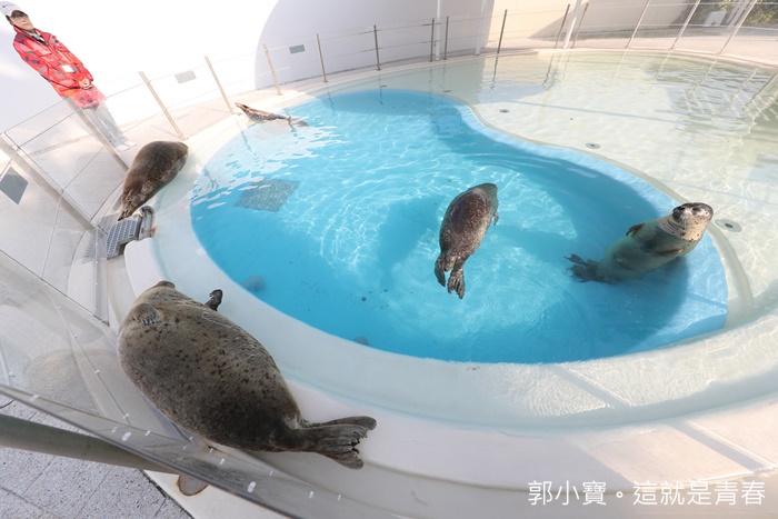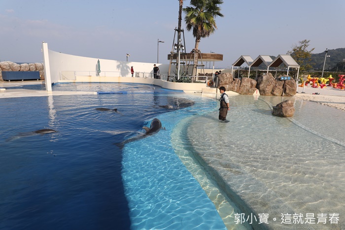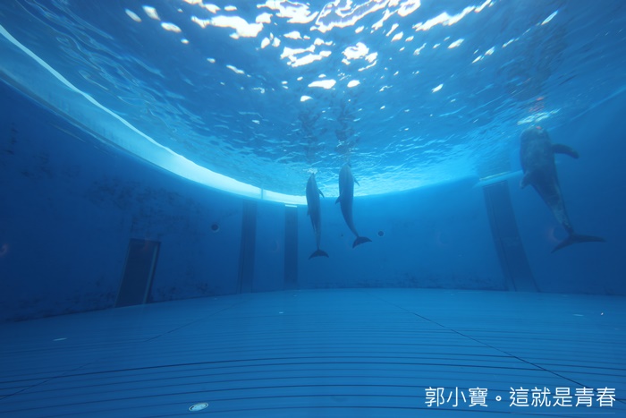 旁邊還可以看到海豚的身影,上面就是海豚的表演池,在裡面的海豚好可愛,可以清楚的看到海豚在這邊遨遊及玩耍真的很特別,以前都只能看到海豚冒出一顆頭,現在還可以看到它們遨遊的身影。 |