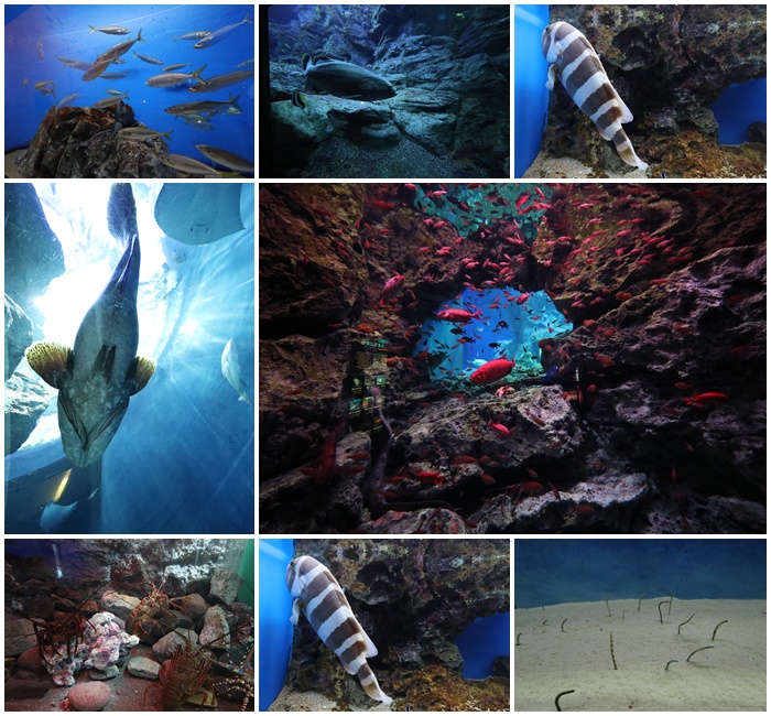大大小小的水族櫥窗讓人看到目不轉睛,彷彿真的就像是在深海裡看著這些海洋生物遨遊,也有透明隧道抬頭一望還可以看到陽光照射,真的非常棒的規劃,跟很多一個一個方形櫥窗的水族館完全不一樣,可以看到不一樣的主題真的很棒,每一個櫥窗都讓人捨不得離開。 |
