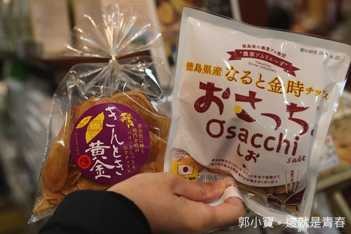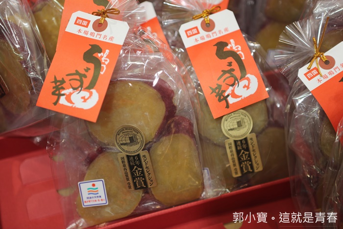 德島在地土產第一名就是鳴門金時,也就是在地的地瓜土產,新鮮地瓜想要帶回台灣又重又不容易,當地有很多鳴門金時的加工商品及零食,但是想要品嘗到真正鳴門金時的滋味就是要買這個新鮮切片地瓜,我這次吃了滿多鳴門金時製作出來的加工品,但是我還是最推薦這個可以吃到纖維的地瓜切片,用糖蜜醃製的工法在台灣也很常看到,重點是可以享受到鳴門金時地瓜本人的口感XDDDDD |