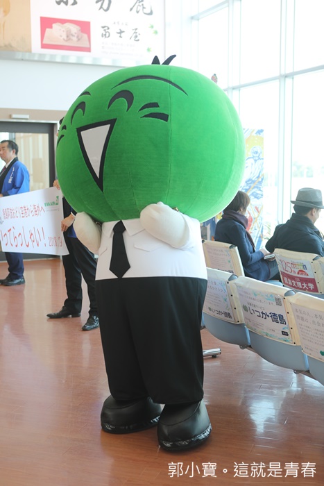 德島縣的吉祥物酸橘君也到機場迎接大家,酸橘軍也是日本眾所皆知的熱門吉祥物,換上機長的制服真的好可愛,而且很熱情的跟每個來到德島的台灣旅客拍照。 |