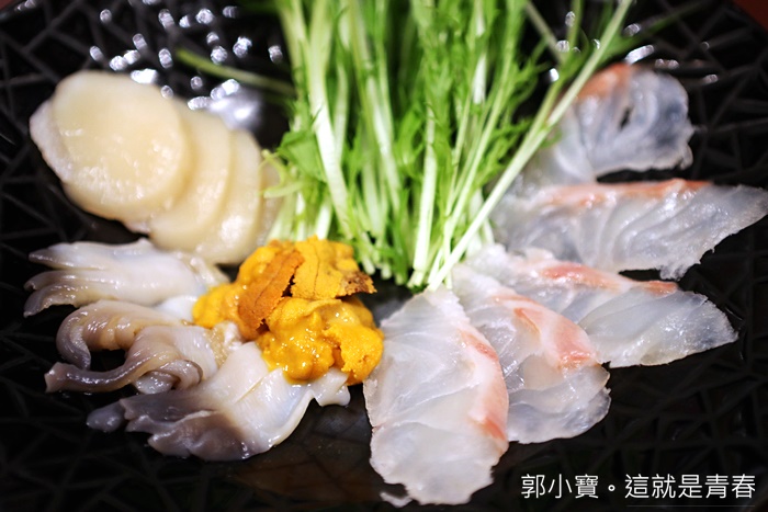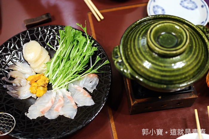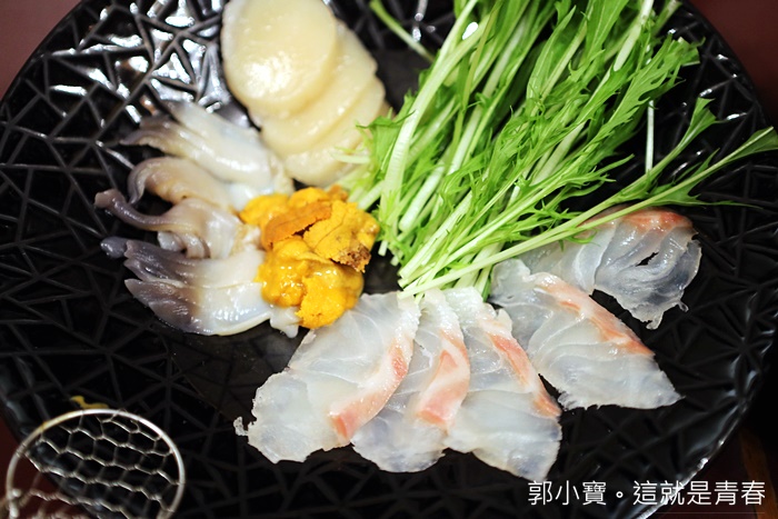 搭配海膽涮涮鍋的食材就是滿滿的海鮮,除了生食等級的生魚片以外還有北寄貝、干貝跟海膽還有野菜,一整個陣容真的還滿豪華的,尤其是北寄貝更是北海道的品質最優。
