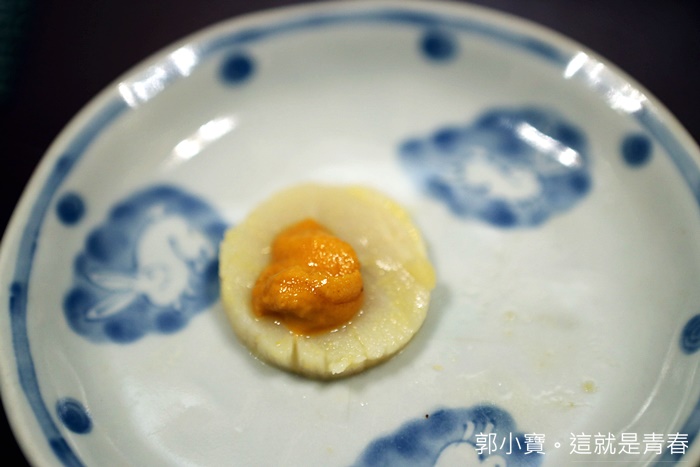 生食等級干貝基本上我就是下去熱一下就上來了,搭配一片海膽一起入口,多麼奢持的一口阿,但是甜味根本就是大爆表,真的好好吃,一整個停不下來! |