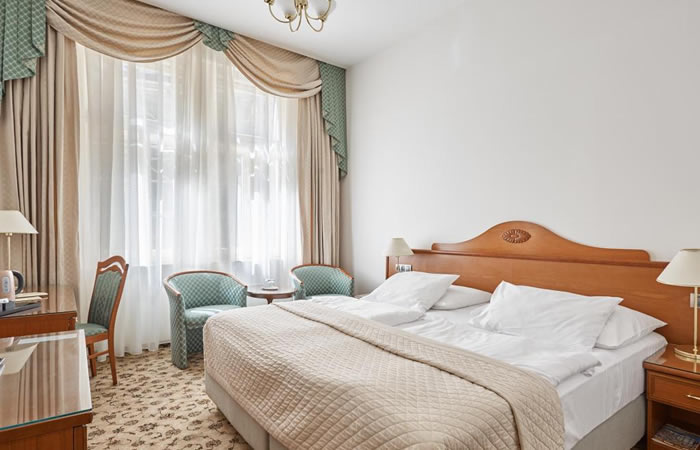 這家酒店幾乎坐落在森林裡,位於卡羅維發利的盡頭,擁有美麗的公園。