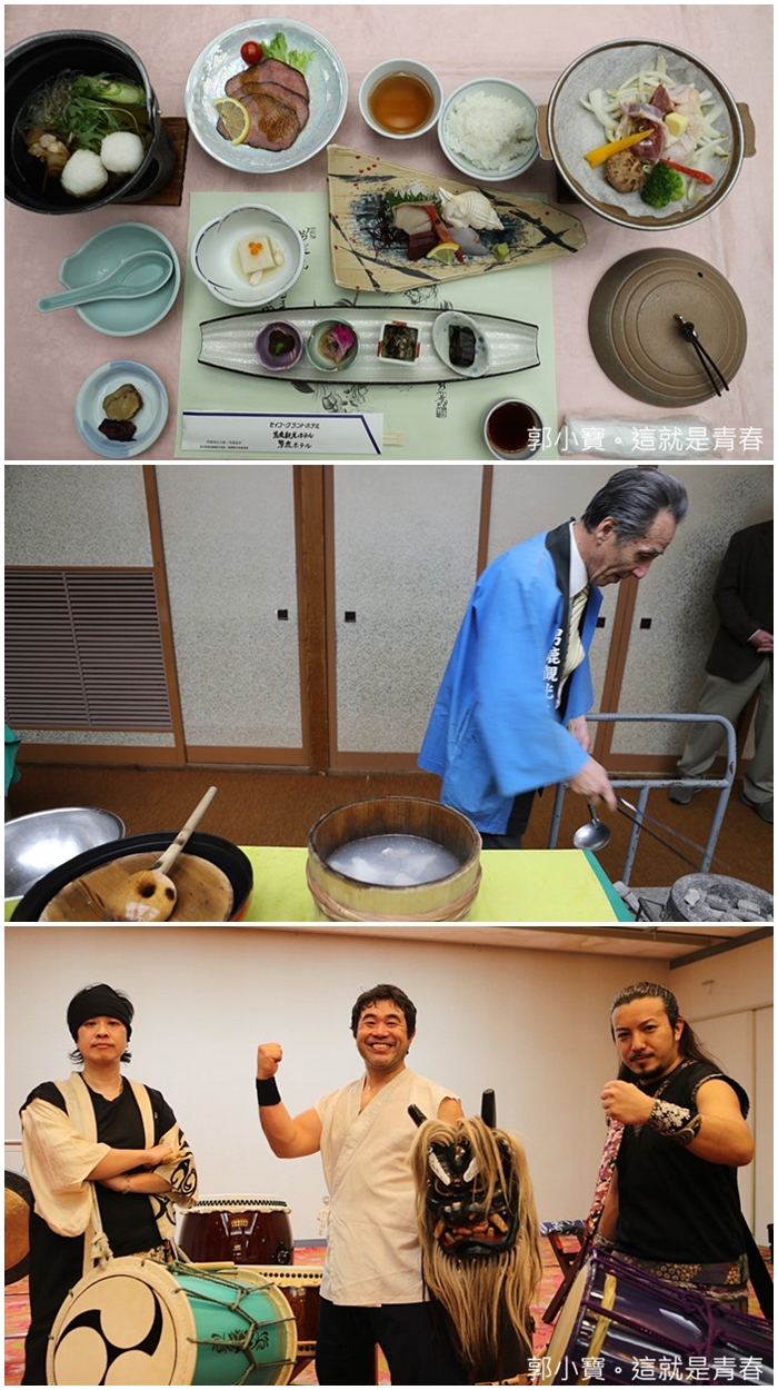 晚餐還有提供當地特色料理,來到這邊就一定要品嘗當地的特色石燒菜,不管視覺上還是味覺上都讓人感覺到震撼,尤其那高達八百多度高溫的石燒放入熱湯中那瞬間滾燙的模樣,魚湯整體的滋味更加的豐富,還有飯店內也都會有鬼神太鼓表演,個人覺得非常非常的精彩,很值得造訪一趟的好表演。