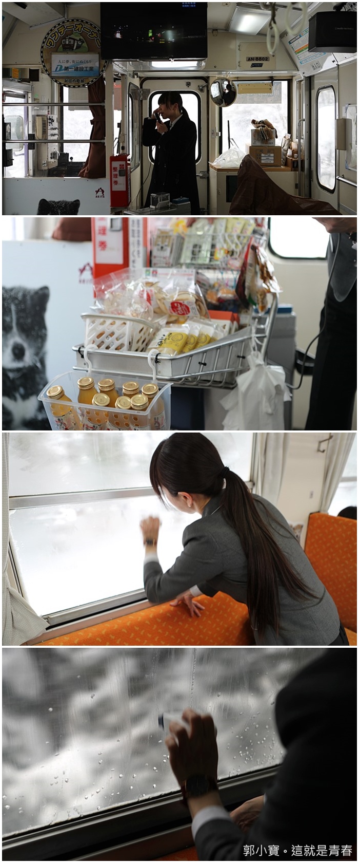 車廂內有很多便於遊客的措施,且電車內的工作人員都超親切的,因為內陸線沿線的風景非常美,但是因為風雪的關係所以窗戶玻璃都會有霧氣覆蓋,工作人員還會用特殊的藥水一個一個窗戶擦過,確保每個乘客都可以欣賞到,電車內還有販售許多當地的特產,我超推薦秋田的蘋果汁,真的超級好喝的,我個人覺得比青森的更香甜,據說秋田其實也是盛產蘋果,且品質一點都不輸給青森,下次有機會來秋田你們也可以來PK一下XDD