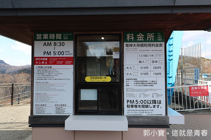 要通過龍神大吊橋需要付料金,也就是要買門票,高空彈跳的人不用另外付費,但是平常要走吊橋就需要買門票了。 |