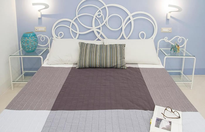 房間設施清新,裝修是海洋風格的藍色調。有一個非常不錯的海景陽台,可以愜意地看海。