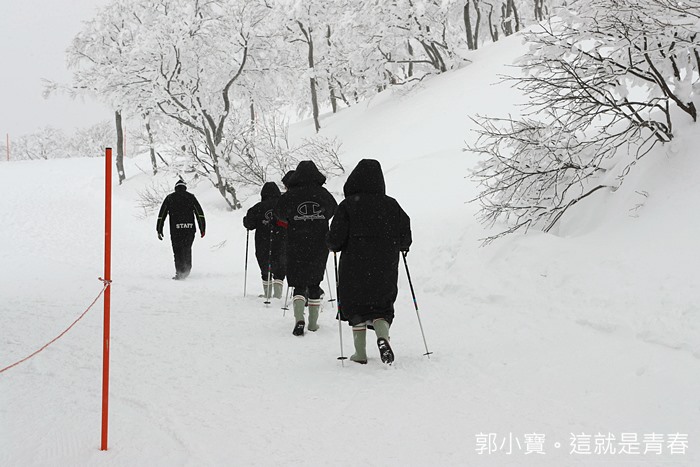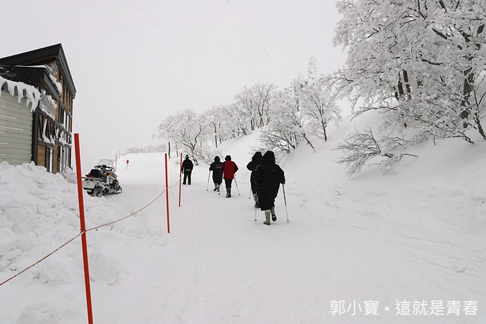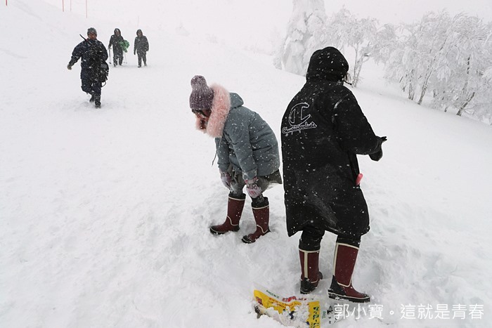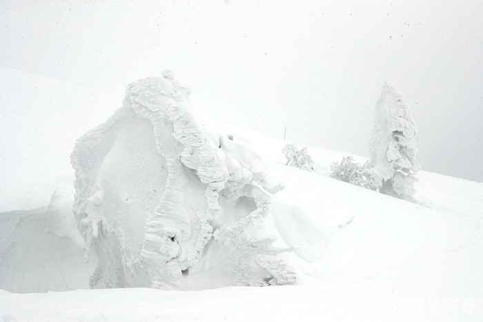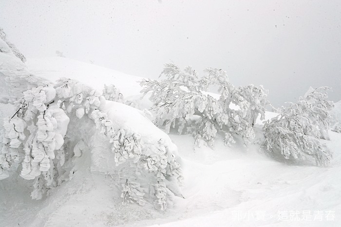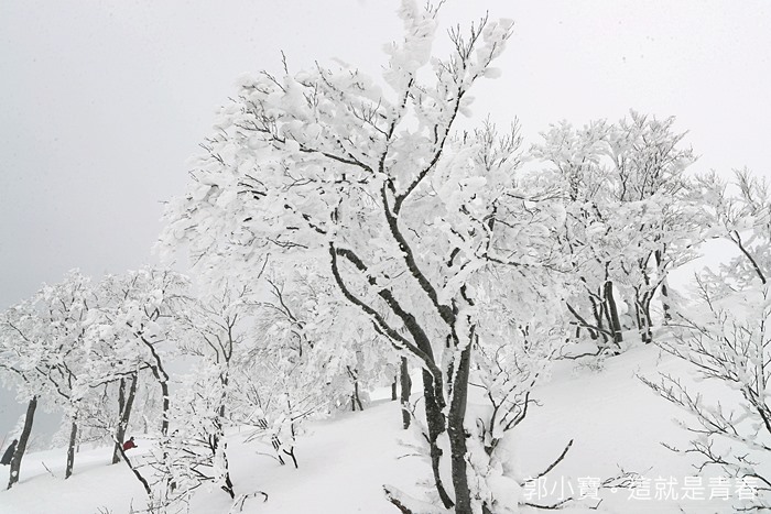 換好裝備後我們一行人就出發往樹冰的聚集地前進了,當天雖然沒有大晴天,但是能見度還算是清晰可見,這樣的天氣我就已經覺得很幸運的,森吉山的降雪量也很恐怖,建議要沿著紅線內的道路行走,不然一不小心你很可能就消失在雪中了。 |