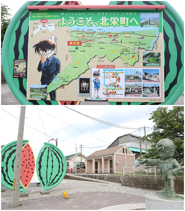 車站口就有超大的柯南公仔跟大家打招呼,依然是國小柯南最招牌的打招呼姿勢,一旁還有北榮町的地圖,裡面的指標都很重要,柯南幾乎是遍佈了這個小鄉鎮一偶,北榮町似乎也是盛產西瓜的地方。 |