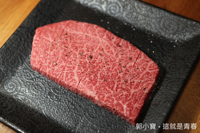 這一塊牛排上來的時候,就覺得油花也很美,沒想到萬葉牛連後腿內側肉的油脂也可以有這樣的油花,忍不住吞了幾口口水後,催促著趕快烤來試試看。 |
