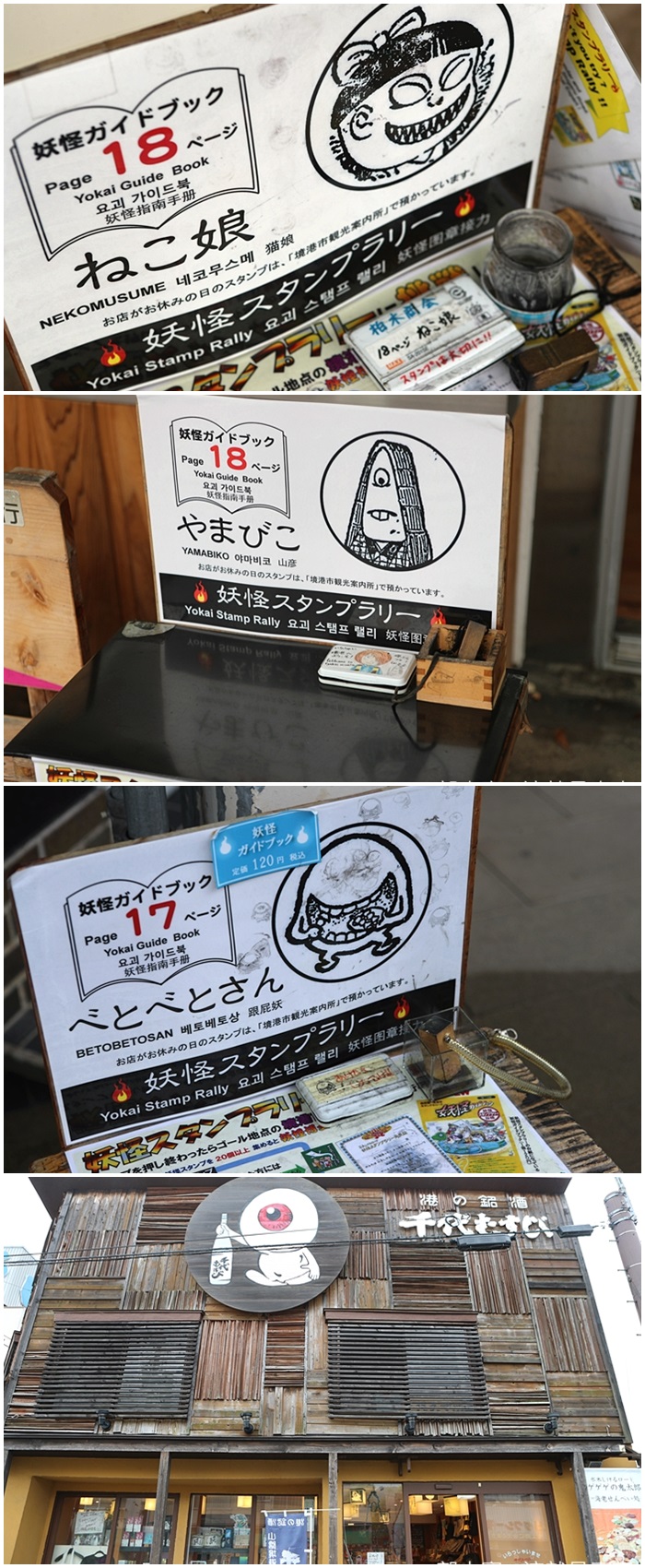 這裡的圖章大概蓋完全部的人物應該可以蓋滿一本,逛街的時候默默的街近商家陸續開門的時間了,可以看到越來越多開門營業的商店,各式各樣的店鋪也都是以鬼太郎為主經營著。 |