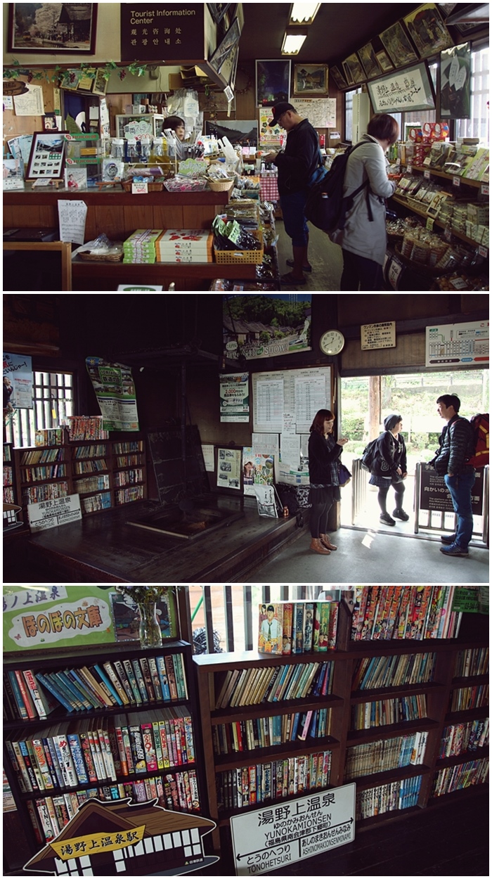 車站內同樣是古色古香,除了有一家老商店就在車站內營業,賣的商品非常多很好買,我每次來湯野上溫泉都會失控的狂買,這邊超多土產可以買的,一旁還有漫畫可以看,真的還滿有趣的。 |