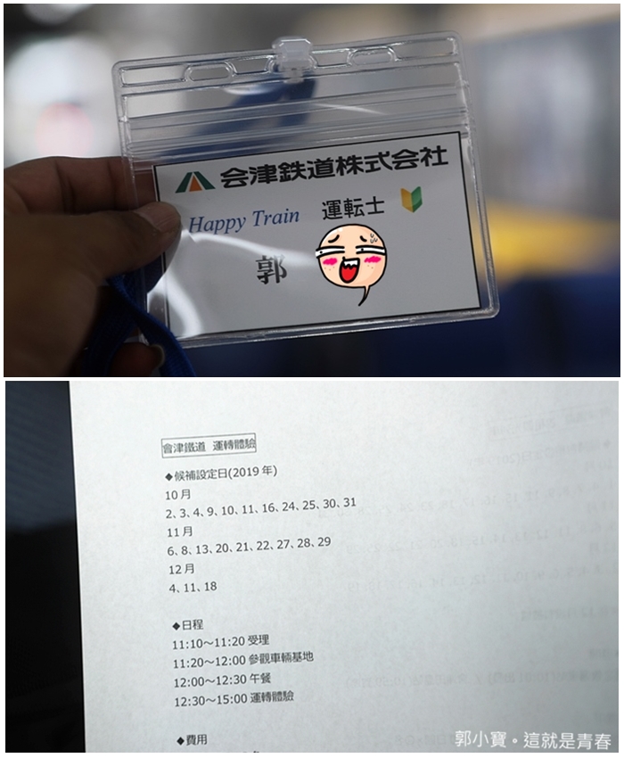 報到手續完成後你就會先領到一張由會津鐵道製作的運轉士的牌子,其實我覺得他的體驗費用很便宜,除了體驗開電車以外,還有附贈鐵路便當跟專人帶你導覽等等活動,還有一些小禮品可以拿,很值得參加!!