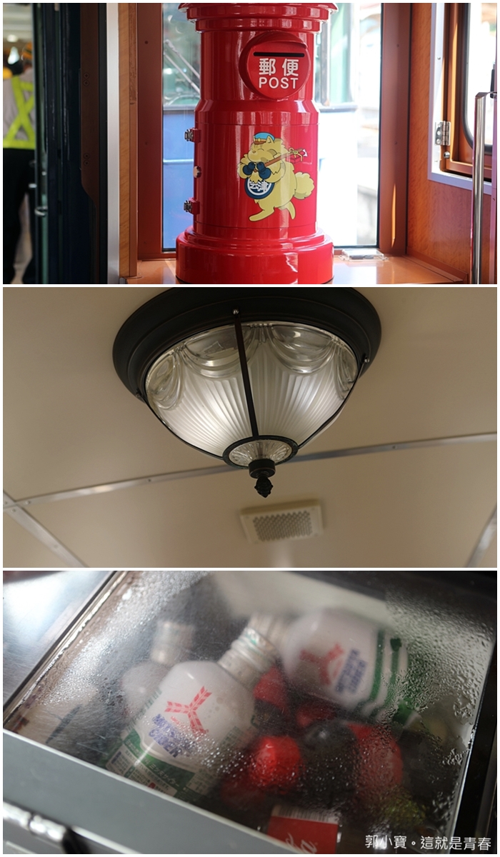 各式各樣的設計真的都很讓人喜愛,尤其車廂上的天花板的造型燈一整個就是濃濃的復古味道,車上的冷飲也都是在地商品及大眾飲料。 |