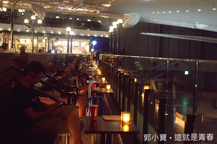 這邊的座位區大多都是公共區域為主,整體的設計也都非常有分為,前排還有一整排像是機場貴賓室的沙發,還有插頭可以替3C產品充電,眼前就是波音夢幻客機,就像在機場裡面一樣,有的人也是特地來這邊喝咖啡上網打電腦。 |